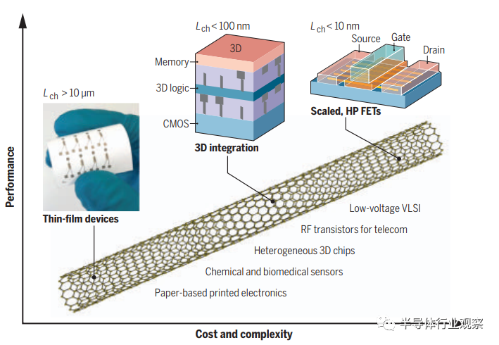 圖1所示:碳納米管晶體管的廣泛潛在應用。說明了碳納米管晶體管的一些最重要的潛在應用的設備性能與成本和復雜性。應用范圍從微型薄膜器件(如印刷電子、生物傳感器)到三維集成BEOL器件(如集成到硅CMOS上的異質3D層)和規模高性能(HP) FET[如低壓超大規模集成(VLSI)],其性能的提高與集成成本和復雜性的增加相對應。Lch,通道長度。