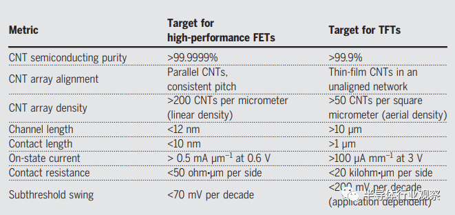 表1:兩個突出的碳納米管晶體管應用的幾個目標指標。值是基于實現最佳性能的近似值。值得注意的是,盡管其中一些目標已經實現,但最重要的挑戰之一是同時實現它們(例如,高通電電流與低閾值下擺動,這是一個衡量調制電流需要多少柵電壓的指標)。高性能FET用于服務器的中央處理單元(CPU)等應用,TFTs是用于顯示器背板電子器件的薄膜晶體管。
