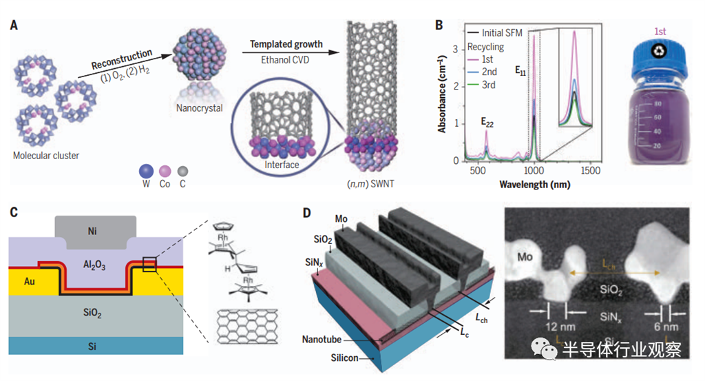 (A)使用難熔W-Co納米晶催化劑的目標手性的模板化碳納米管生長。CVD,化學氣相沉積;SWNT,單壁納米管。