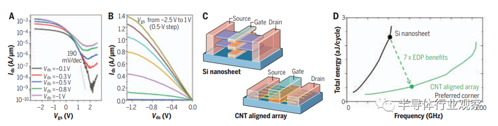 盡管許多應用可以從碳納米管的特性中受益,但數字邏輯應用受到了最大的關注(圖4),因為它們有潛力在性能和能源效率上超越現有的Si技術。這種典型的高性能器件來自碳納米管的對齊陣列,可以在相對較低的電壓下實現高的通態電流(圖4,A到C)。如圖4D所示,在2納米技術節點(EDP,或開關能量),與Si納米片相比,摻雜擴展和多層高密度碳納米管的門全能碳納米管晶體管預計將顯示多達7倍的能量延遲積(EDP)效益,是一個開-關循環的時間和功耗的乘積,也是能源效率的衡量標準)。正如前面所提到的,由于其超薄的結構(約1nm),碳納米管晶體管即使在柵極長度上也能提供出色的靜電控制,僅受直接源-漏隧道的限制。寄生電容是影響速度和能量效率的關鍵因素,占現代硅晶體管總電容的70%。由于其超薄的結構,碳納米管晶體管具有非常低的寄生門源或門漏電容。CNTs的這兩個關鍵屬性,以及高傳輸和注入速度,是高性能、節能數字邏輯的物理基礎。