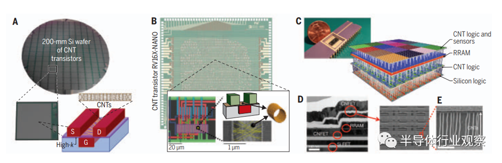 圖5:碳納米管晶體管的晶圓規模和三維集成。